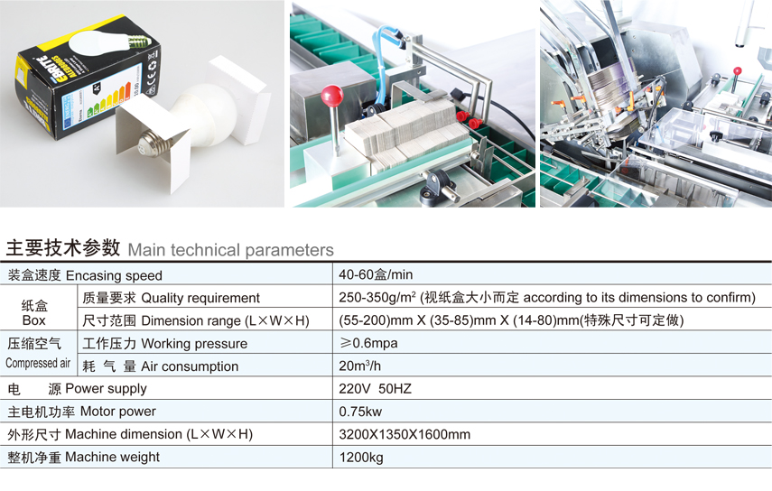 本產品是我公司結合國外包裝機的先進技術及根據目前照明、電子等行業的實際情況而研發的具有新型、先進的包裝機械設備,是機、電、氣、光一體化的高科技產品。本產品適用于照明、電子等行業各類球泡燈、蠟燭燈等以及相類似物品的裝盒包裝。具有將紙盒自動打開、兩頭內襯自動上料、物品帶內襯裝盒、封盒等功能;同時也是解決目前招工難、管理難而代替勞動力的先進自動包裝設備。該機可以單獨使用亦可以與其他設備聯動使用,形成成套生產聯動線。