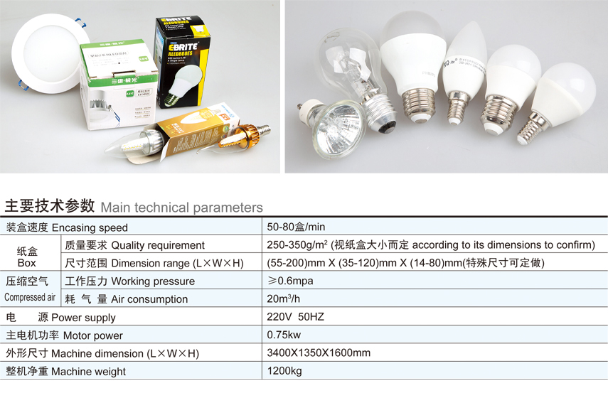 本產(chǎn)品是我公司結(jié)合國外包裝機的先進技術(shù)及根據(jù)目前照明、電子等行業(yè)的實際情況而研發(fā)的具有新型、先進的包裝機械設(shè)備,是機、電、氣光一體化的高科技產(chǎn)品。本產(chǎn)品適用于照明、電子等行業(yè)各類球泡燈、蠟燭(尾)燈、筒燈、射燈、單端熒光燈、節(jié)能燈、鎮(zhèn)流器等等以及相類似物品的裝盒包裝。具有將紙盒自動打開、物品裝盒、封盒等功能;同時也是解決目前招工難、管理難而代替勞動力的先進自動包裝設(shè)備。該機可以單獨使用亦可以與其他設(shè)備聯(lián)動使用,形成成套生產(chǎn)聯(lián)動線。